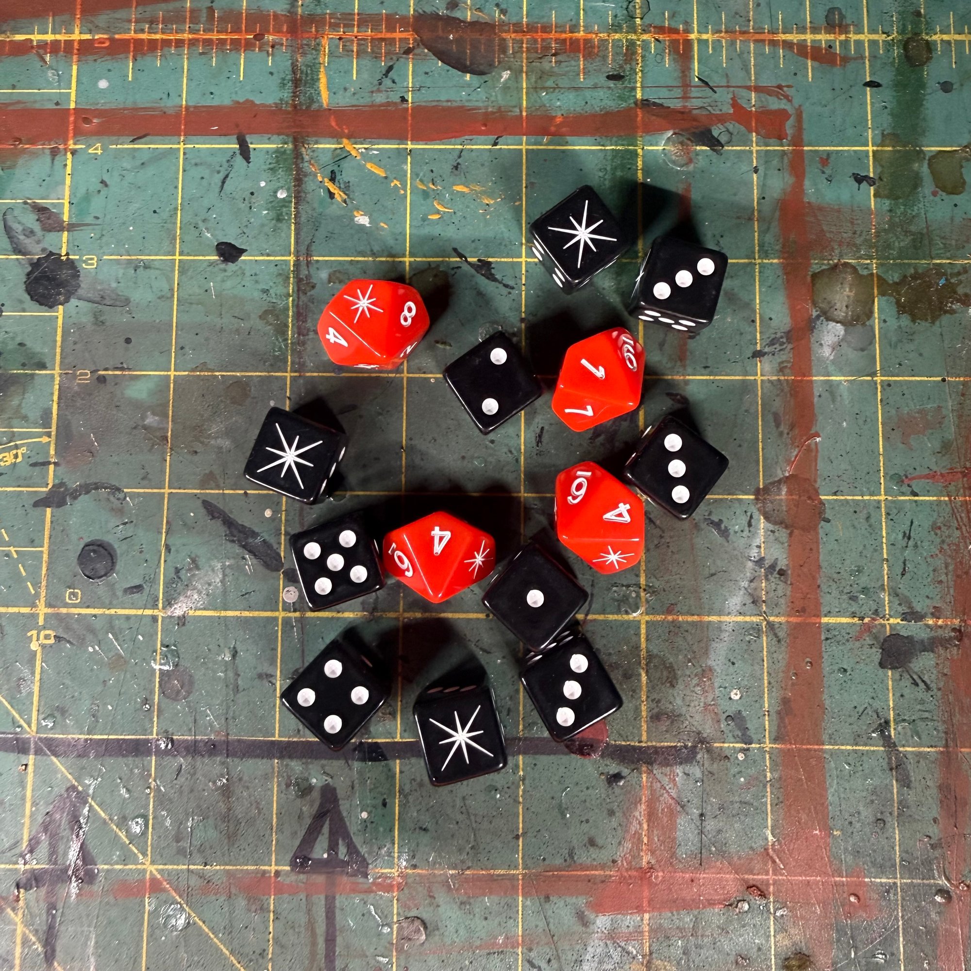A set of dice made for Flames of Orion. An exploding star on the 6 of the d6 and the 10 of the d10. 100 sets were made.